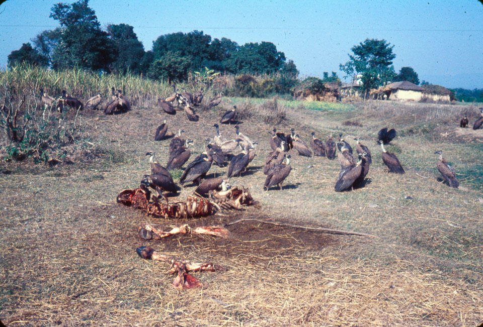 Description: Vultures eating a dead cow. Often, the first signs of an impending animal death are vultures circling overhead. Sometimes the vultures wait by a dying animal; they begin their task close to or even before the actual death moment, beginning with the softest tissues, and progressively work their long, naked necks into the body. These birds have huge wingspans. While majestic in the air, their landings and take offs are not smooth affairs. These birds break open the body and make it easier for the village dogs and jackals and other birds to join the devouring process; these animals compete for pieces of the carcass. In 24 hours, nothing of the animal is left but bones. About twice a year, bullock carts come through the villages to pick up the bones and take them to India where they are used for fertilizer. Keywords: Bob Nichols, Nepal Photo History Project, Peace Corp Photo History, agriculture, animal
