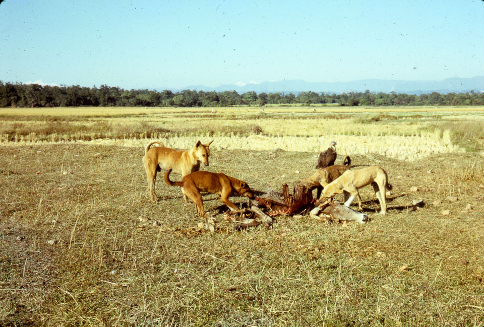 Description: Dogs eating a dead cow, with a vulture waiting for a turn in the background. Often dogs and vultures openly compete for pieces of the carcass. Twenty-four hours after death, nothing of the animal is left but bones. About twice a year, bullock carts come through the villages to pick up the bones and take them to India where they are used for fertilizer. Picture is taken toward the northwest. Nepal foothills in background; far right is a snow capped mountain in the Himalayas. Trees in the background may be the start of the jungle area. Keywords: Bob Nichols, Nepal Photo History Project, Peace Corp Photo History, agriculture, animal