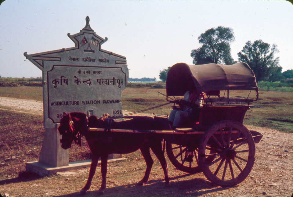 Description: Horse and cart, in front of the sign for the agriculture research station at Parwanipur. This site developed new and improved agricultural crops and techniques that were then shared with farmers in Nepal's Terai. Peace Corps Volunteers working in the Terai used this site for training purposes. Note the Nepal/US flags on the sign in back. The horse and cart were common, serving as "taxis" on the black top road to Birgunj. Keywords: Bob Nichols, Nepal Photo History Project, Peace Corp Photo History, community, government building, horse, transportation