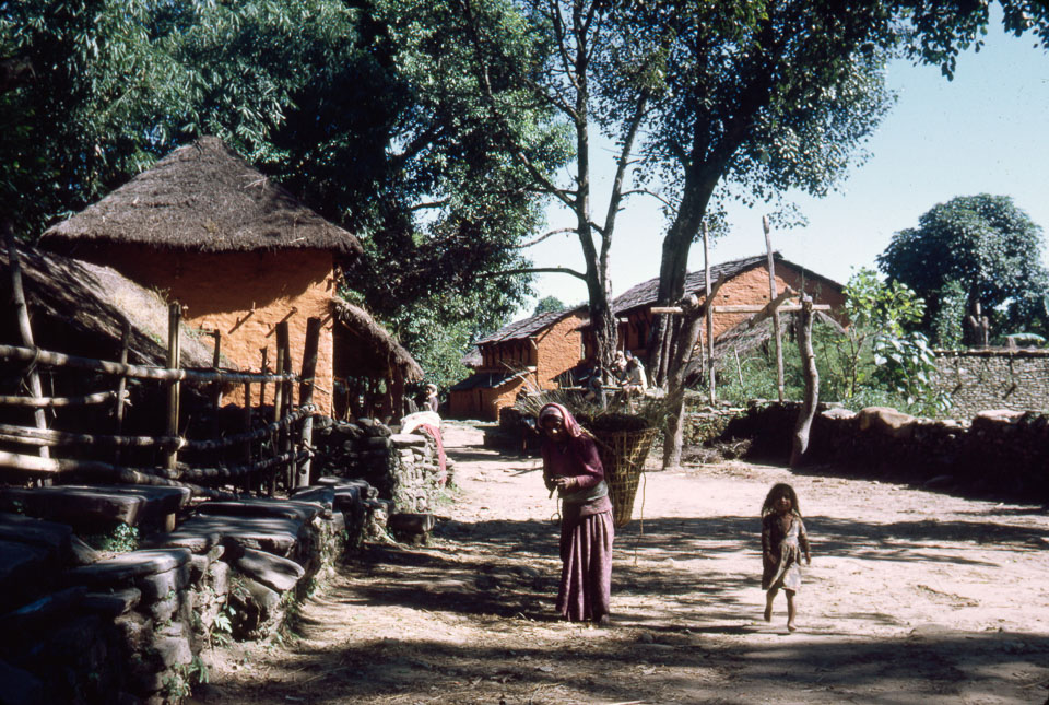 Description: Village street scene; woman with basket and girl. This may be just outside Pokhara. Keywords: Bob Nichols, Nepal Photo History Project, Peace Corp Photo History, community, landscape, street scene, town, village