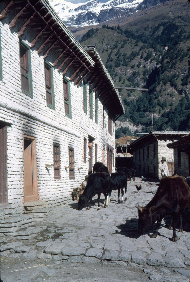 Caption: Date: 1967-10 Location: Marpha, Mustang Description: Cows, chicken on Marpha's main street. Keywords: Bob Nichols, Nepal Photo History Project, Peace Corp Photo History, agriculture, animal, community, landscape, street scene, town, village