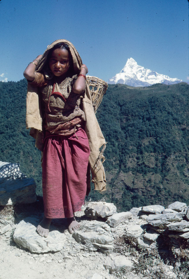 Description: Girl carrying basket. Machhapuchchhre behind. Picture taken at the Pokhara end of the Pokhara-Jomsom trek. Keywords: Bob Nichols, Nepal Photo History Project, Peace Corp Photo History, People, child, landscape, named mountain, portrait
