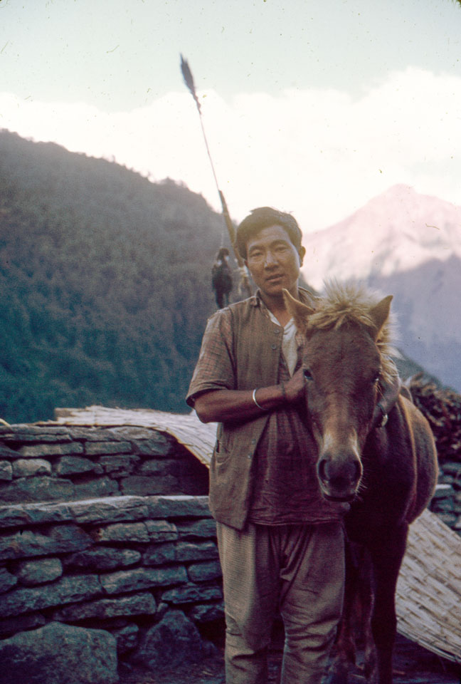 Caption: Date: 1967-10 Location: Mustang Description: Man with horse; dead crow hanging on pole. Keywords: Bob Nichols, Nepal Photo History Project, Peace Corp Photo History, People, horse, portrait, transportation