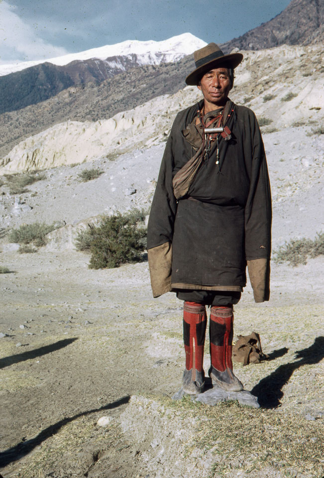 Caption: Date: 1967-10 Location: Mustang Description: Man on trail. The coat's arm length extends over the hands for warmth. Keywords: Bob Nichols, Nepal Photo History Project, Peace Corp Photo History, People, portrait