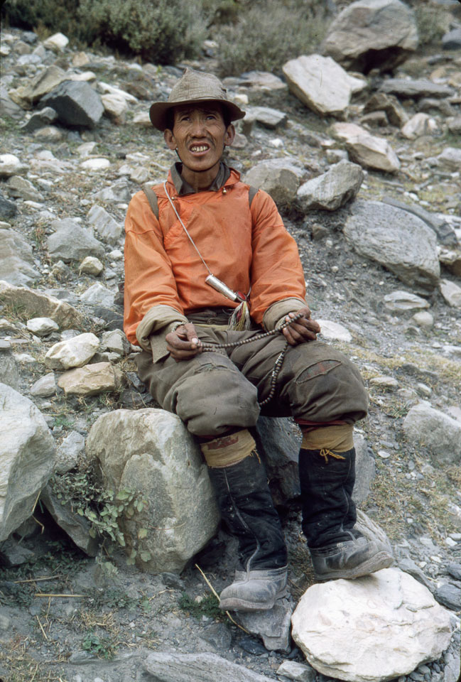 Description: Man with prayer beads on trail. His shirt was said to have been made from parachute material, reportedly "from the CIA." Keywords: Bob Nichols, Nepal Photo History Project, Peace Corp Photo History