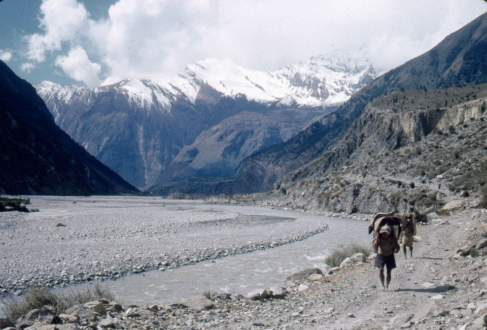 Description: Porters on trail along the Kali Gandaki river. Keywords: Bob Nichols, Nepal Photo History Project, Peace Corp Photo History, countryside, footpath, landscape, porter, river, stream, transportation