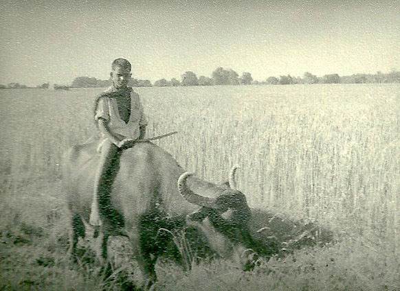 Caption: Date: 1967 Location: Biruwa Guthi, Parsa Description: Boy riding water buffalo. Wheat field in the back. Riding a water buffalo in this way was a common village scene. Keywords: Bob Nichols, Nepal Photo History Project, Peace Corp Photo History, agriculture, animal, field