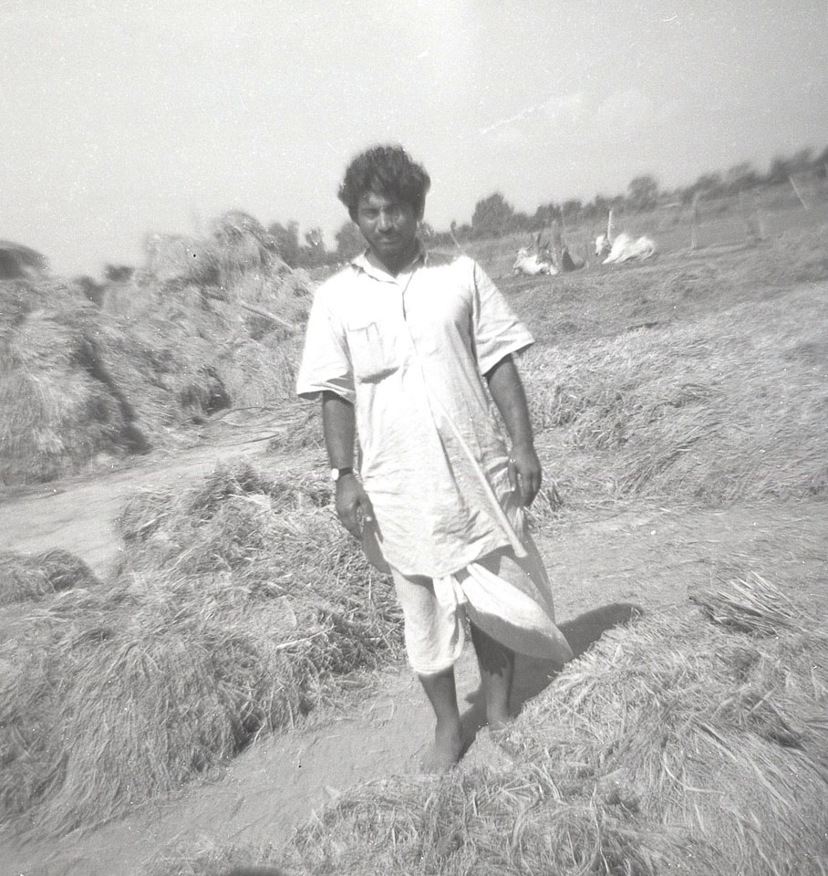 Description: Gaul Singh, standing in his threshing area at his farm near Jitpur. He was a well-to-do, progressive farmer who received an agriculture award from the district panchayat. The wrist watch he is wearing was highly uncommon. Keywords: Bob Nichols, Nepal Photo History Project, Peace Corp Photo History, People, agriculture, named person, threshing