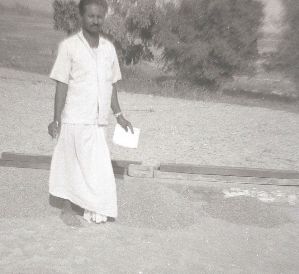 Caption: Date: 1967 Location, Biruwa Guthi, Parsa Description: Babu Sahib (whose last name may have been Singh) standing in front of three piles of wheat that illustrated wheat growing techniques. From left to right: Improved wheat with irrigation; unimproved wheat seed with irrigation; and unimproved wheat without irrigation. Babu Sahib was a well-to-do landowner who lived in the village and who served as Pradhan Panch. He is wearing a watch on his left hand. Wearing watches was not common. Keywords: Bob Nichols, Nepal Photo History Project, Peace Corp Photo History, People, agriculture, named person, produce