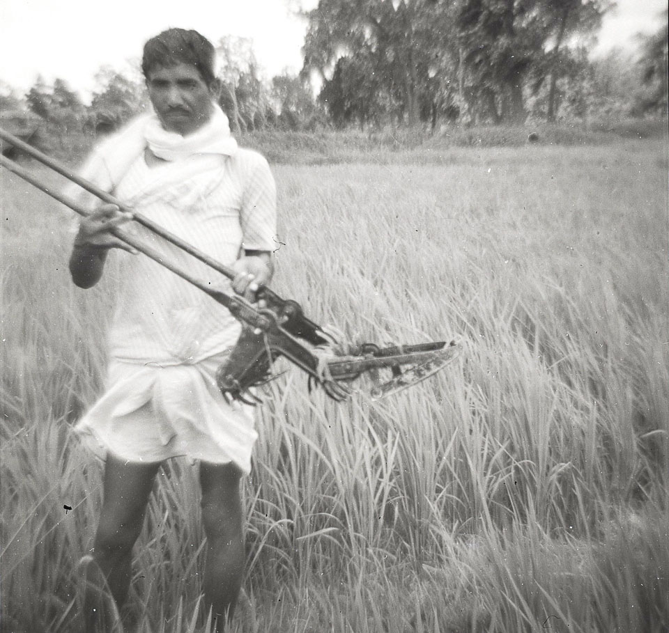 Caption: Date: 1967 Location: Parsa Description: Field demonstration of new agricultural tool (rice cultivator), to be used between rows of rice). Keywords: Bob Nichols, Nepal Photo History Project, Peace Corp Photo History, agriculture, home life, paddy, tools