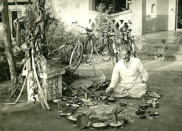 Caption: Date: 1967 Location: Birganj, Parsa Description: Puja being conducted by a family pandit. Keywords: Bob Nichols, Nepal Photo History Project, Peace Corp Photo History, People, event, priest/monk/lama/nun, puja, religious service