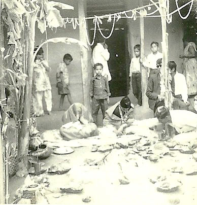 Caption: Date: 1967 Location: Parsa Description: Wedding scene. May be in Birganj. Bride's head covered, left. Seated groom to the right. Keywords: Bob Nichols, Nepal Photo History Project, Peace Corp Photo History, event, wedding