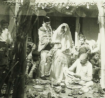 Caption: Date: 1967 Location: Parsa Description: Wedding scene. May be in Birganj. Groom and bride are standing. Man seated on right is the family pandit who conducted the wedding ceremony. Keywords: Bob Nichols, Nepal Photo History Project, Peace Corp Photo History, People, event, priest/monk/lama/nun, wedding