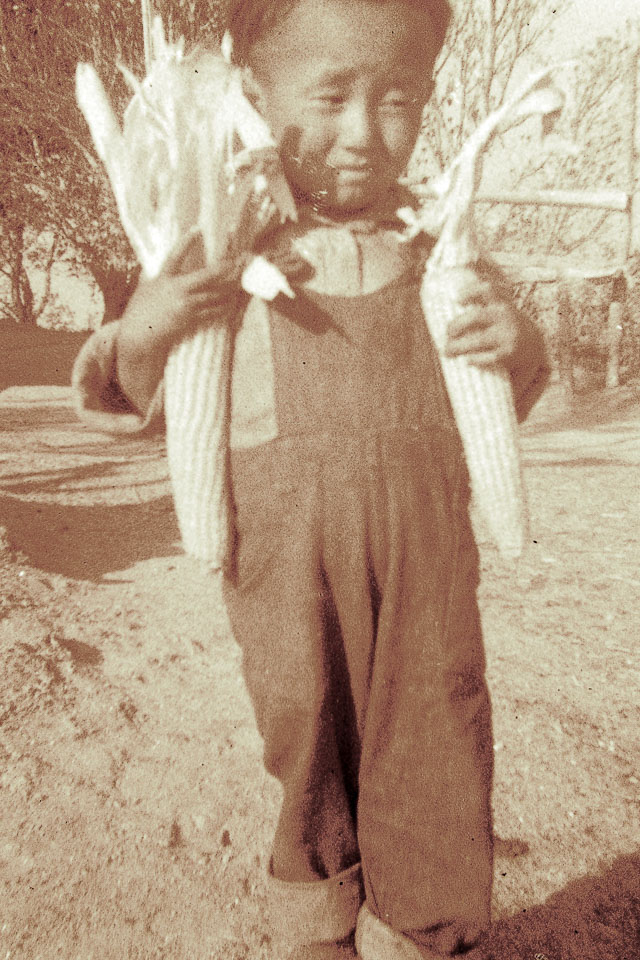 Description: Boy holding two ears of corn, "Khumaltar Yellow." This may be at an agriculture facility located at Khumaltar; the boy may be from the Tibetan refugee camp located nearby. Keywords: Bob Nichols, Nepal Photo History Project, Peace Corp Photo History, People, agriculture, child, harvest, portrait
