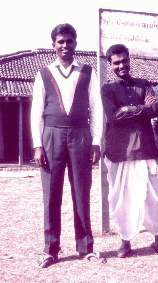 Caption: Date; 1967 Location: Biruwa Guthi, Parsa Description: Mr. Mallick on left. He worked with the district agricultural coop program and was assigned to the panchayat. Dip Naryan Deo on right. He was a Junior Technical Assistant ("JTA") assigned to the panchayat. The panchayat house is in the background. Both left the panchayat later in 1967. Deo went to India to study agriculture under a U.S. Agency for International Development sponsored program. Keywords: Bob Nichols, Nepal Photo History Project, Peace Corp Photo History, People, community, government building, named person