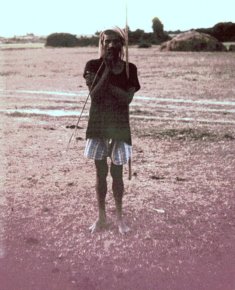 Caption: Date: 1967 Location: Parsa Description: Man holding sticks, outside village. The village may be Biruwa Guthi. The stick on left (his right) may be for tending cattle. Keywords: Bob Nichols, Nepal Photo History Project, Peace Corp Photo History, People, agriculture, shepherding, tending animals