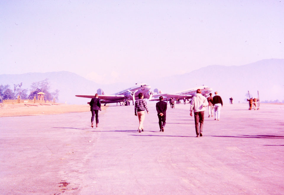 Caption: Date: 1967 Location: Kathmandu, Kathmandu Description: Two DC3s at the Kathmandu Airport. Picture was taken in early 1967. Steps to get on the airplane (right) are being moved to one of the planes. Keywords: Bob Nichols, Nepal Photo History Project, Peace Corp Photo History, airfield, airplane, transportation