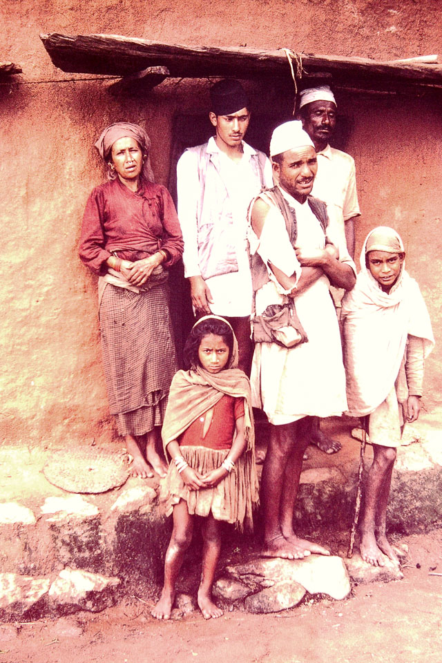 Caption: Date: 1971 Location: Hile, Dhankuta Description: Farmer Ganesh Bahadur Deoja, back right (eyes closed). His wife is left, with red top. Keywords: Bob Nichols, Families, Family, Nepal Photo History Project, Peace Corp Photo History, People, group photo, named person