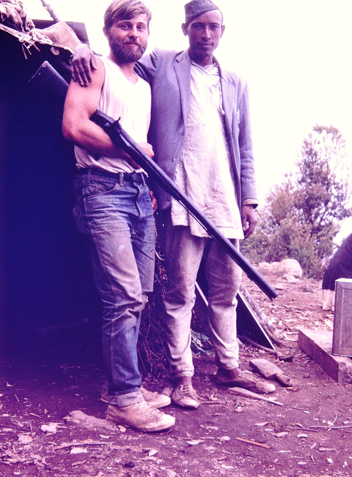 Caption: Date; 1971-05 Location: Hathikharka, Dhankuta Description: Peace Corps volunteer Steve Sass (left) and his landlord Durga Prasad Karki (right). Hunting rifles were prized possessions. Keywords: Bob Nichols, Nepal Photo History Project, PC volunteer, Peace Corp Photo History, People, hunter, named person