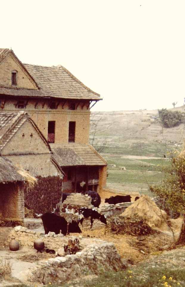 Caption: Date: 1971-02 Location: Kathmandu Description: House on farm land. May be near Kirtipur. Keywords: Bob Nichols, Nepal Photo History Project, Peace Corp Photo History, home life, house exterior