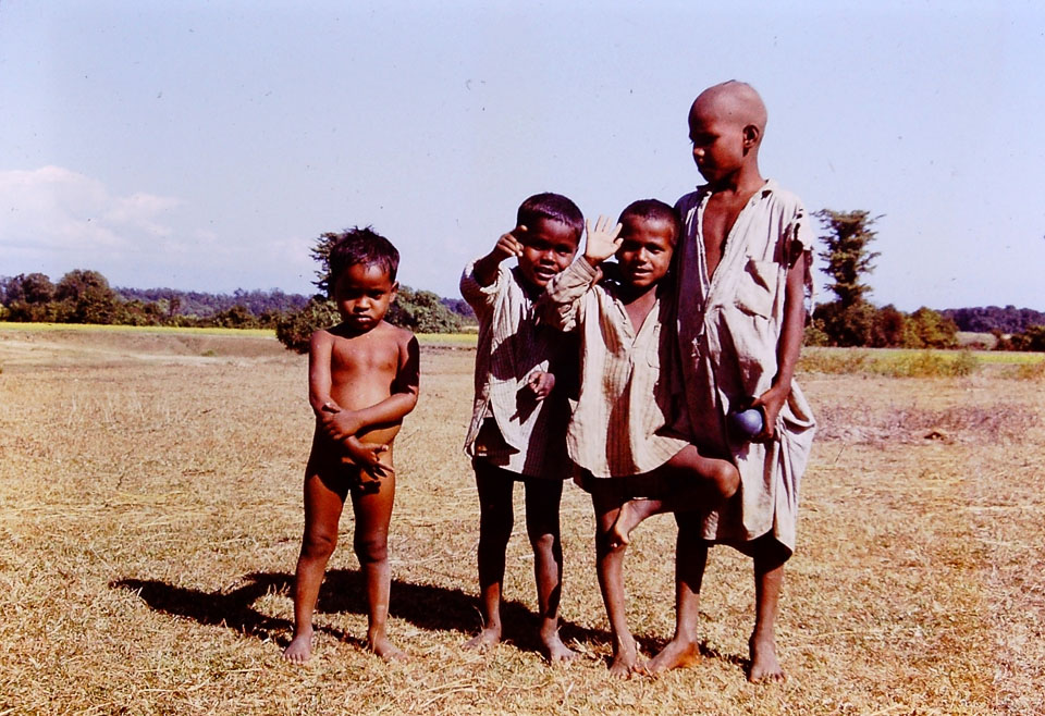 Caption: Date: 1966-1967 Location: Biruwa Guthi, Parsa Description: Four boys from the village. Buduwa is second from left. To his right is Saligiel. Boy on right is holding a blue ball. Picture faces north; jungle is behind. Keywords: Bob Nichols, Nepal Photo History Project, Peace Corp Photo History, People, child, named person