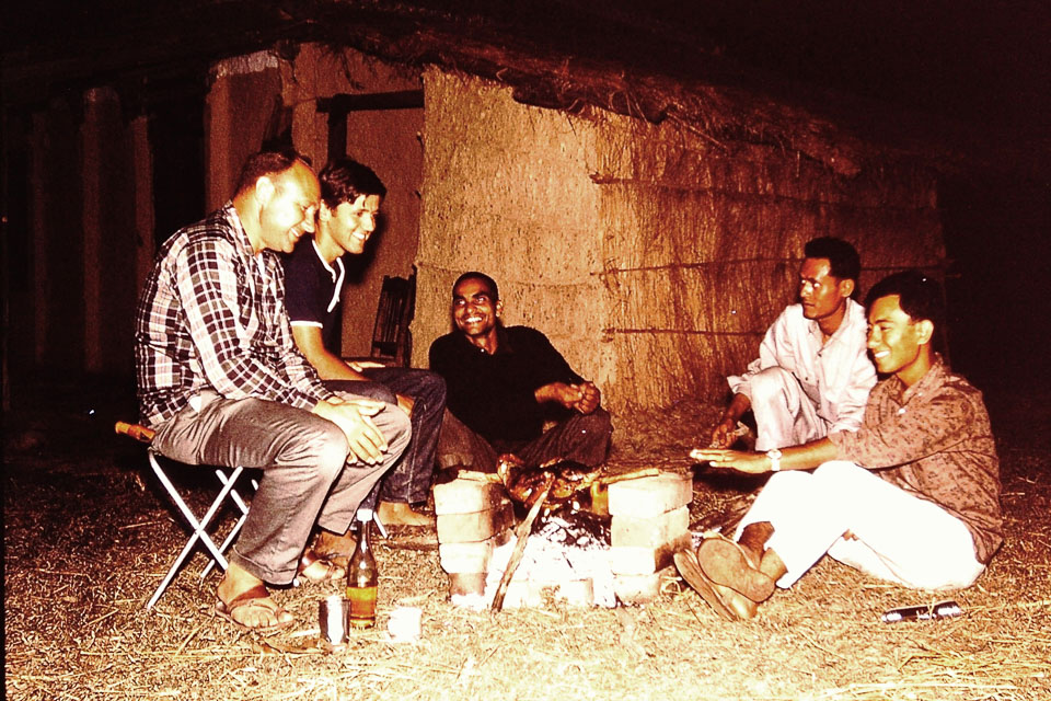 Caption: Date: 1966-1967 Location: Biruwa Guthi, Parsa Description: Nepali agricultural officials meeting in the evening with Ralph Johnson, U.S. Agency for International Development agricultural expert, who is on the left. To his right is Bill Borsa, Peace Corps Volunteer. To his right is Dip Narayan Deo, agricultural extension agent assigned to Biruwa Guthi Panchayat. Picture is taken by the panchayat house. Keywords: Bob Nichols, Nepal Photo History Project, PC volunteer, Peace Corp Photo History, People, named person