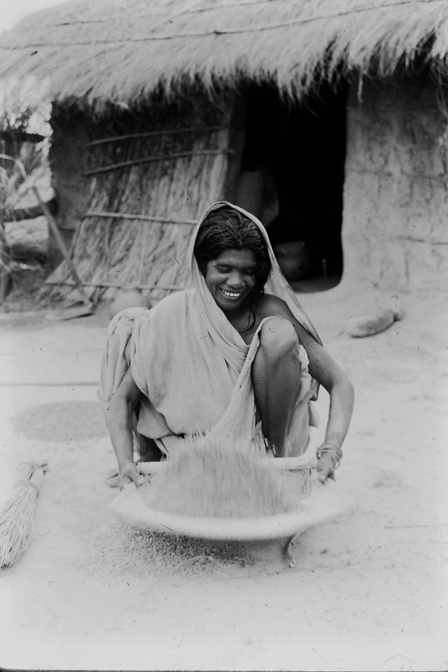 Caption: Date: 1966-1967 Location: Biruwa Guthi, Parsa Description: Woman winnowing rice in front of her home. Brush/broom, left, is used to sweep up the grain. Hoe ("kodali"?) leaning against the hut, left, rear. Keywords: Bob Nichols, Nepal Photo History Project, Peace Corp Photo History, agriculture, winnowing