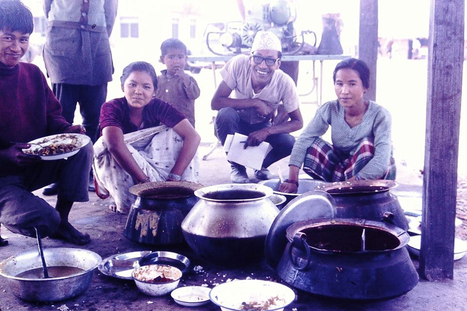 Caption: Date: 1967 Location: Rampur, Chitwan Description: Cooking staff for a Peace Corps-Nepal Ag joint agricultural training program, likely at the agricultural institute in Rampur. Keywords: Bob Nichols, Nepal Photo History Project, Peace Corp Photo History, cooking, event, home life, training event