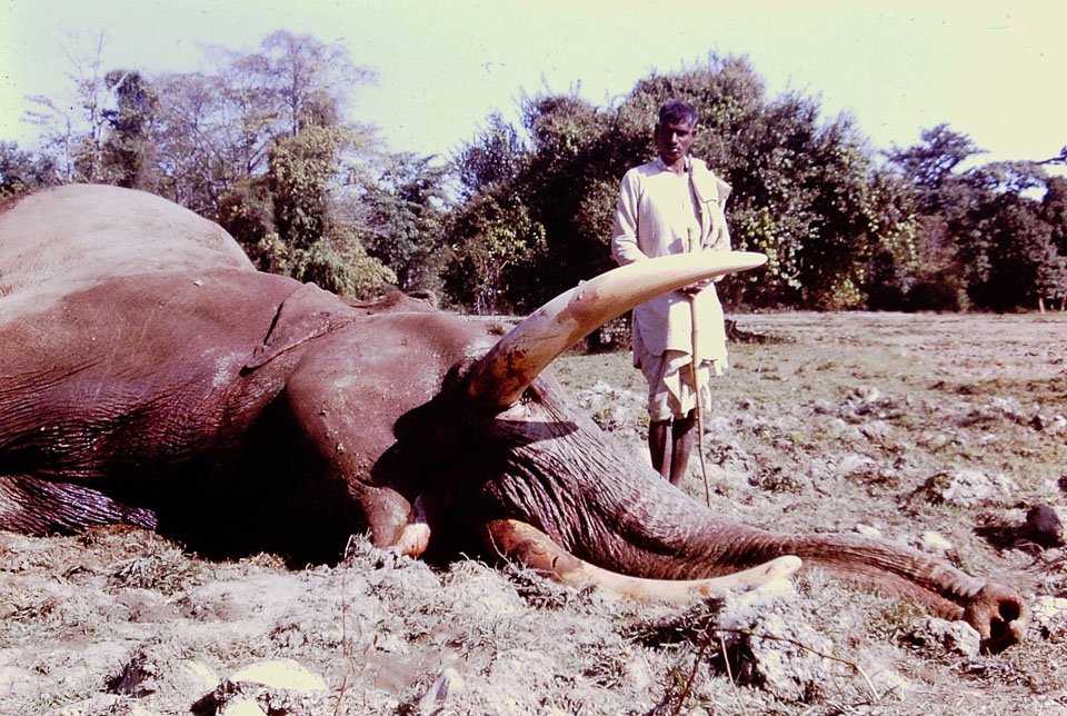 Caption: Date: 1967 Location: Biruwa Guthi, Parsa Description: Dead elephant, close to the jungle. The word was that this elephant was once part of the royal group of elephants and that it had been released to the jungle. The villagers knew this elephant and referred to it as "Ganesh." There was a fight with another elephant and this one died. Blood is plainly visible on the neck. It is not known what happened to the tusks afterwards; district officials may have been involved to deal with that issue. The body of the elephant was said to have been buried. Keywords: Bob Nichols, Nepal Photo History Project, Peace Corp Photo History, elephant, transportation