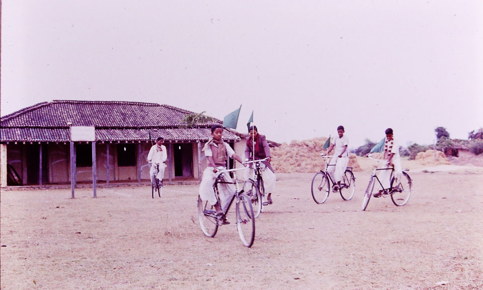 Caption: Date: 1967 Location: Biruwa Guthi, Parsa Description: Election campaign for panchayat pradhan panch. Man and boys on bicycles with green flag in front of the panchayat house. They supported the challenger (Bishawnath Chaudhary from Biruwa) over Babu Sahib (last name was Singh) who was running for re-election as pradhan panch. Bishawnath Chaudhary won this election. Threshing area behind the panchayat house, right. Keywords: Bob Nichols, Nepal Photo History Project, Peace Corp Photo History, People, bicycle, community, election, event, government building, named person, political event, transportation