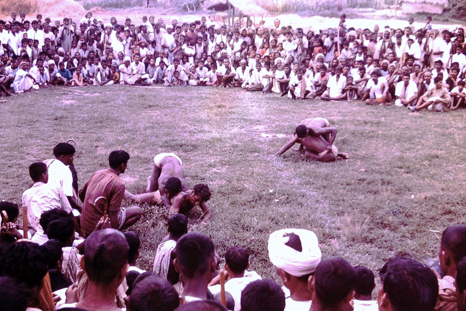 Caption: Date: 1967 Location: Biruwa Guthi, Parsa Description: Men wrestling. This event occurred early in the year, perhaps January or February. The event also involved stick fights between men. The sticks can be seen among the men surrounding the wrestlers. Keywords: Bob Nichols, Nepal Photo History Project, Peace Corp Photo History, event, games, home life