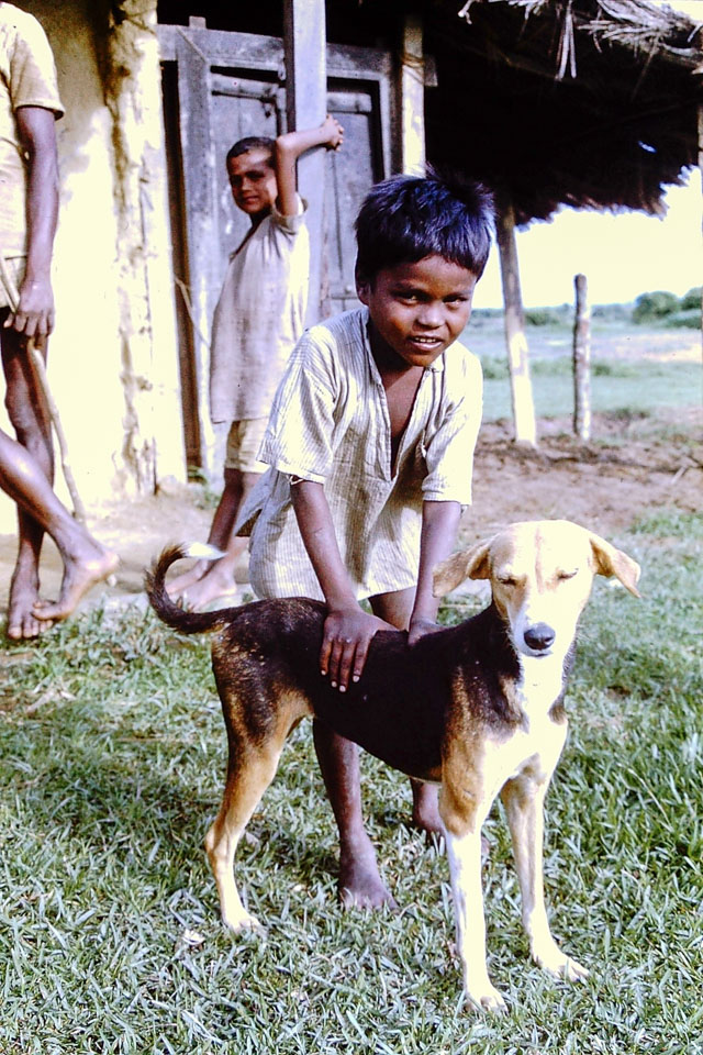 Caption: Date: 1966-1967 Location: Biruwa Guthi, Parsa Description: Two boys by the panchayat house. Boy in the back is Saligiel. Boy in front with dog is Buduwa. They were good friends. To the right of the door in the background was a shed with straw walls covered by plastered mud and dung. Cows ate the straw from the walls leaving the shed without walls (the problem was corrected by building a fence around the house). Keywords: Bob Nichols, Nepal Photo History Project, Peace Corp Photo History, People, child, named person