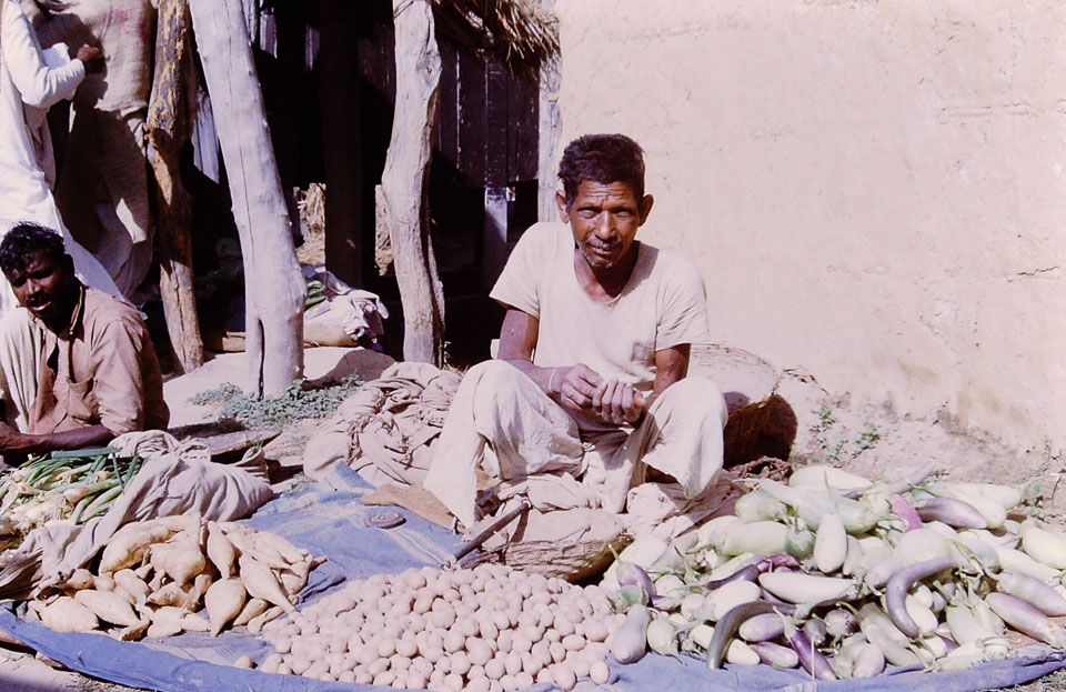 Caption: Date; 1966-1967 Location: Biruwa Guthi, Parsa Description: Man selling vegetables (probably onions, left; potatoes center; egg plant right) at the market. Keywords: Bob Nichols, Nepal Photo History Project, Peace Corp Photo History, commerce, haat, market