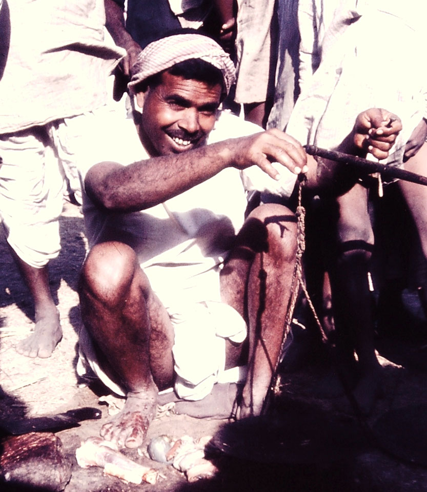Caption: Date: 1966-1967 Location: Biruwa Guthi, Parsa Description: Man selling goat meat at the weekly market. This man would bring two or three goats to the market and tie them to a pole. He would slit the throat of one and carve off the meat to sell. If there were enough "demand" he would repeat the process with the second and third goats. All parts from the slain goat were sold, including the head and hooves. Keywords: Bob Nichols, Nepal Photo History Project, Peace Corp Photo History, commerce, haat, market