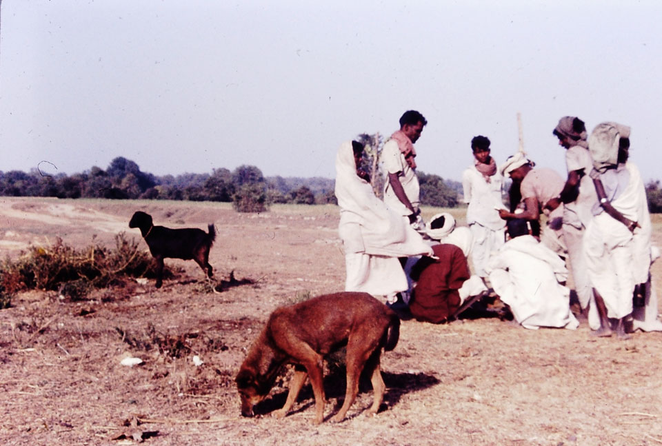 Caption: Date: 1966-1967 Location: Biruwa Guthi, Parsa Description: Selling goat meat at the weekly market. A slain goat is hanging from the pole on the right (not visible) with villagers gathered around; meat would be carved from this goat, weighed and sold. A second goat is on the left, to be slain if there were enough demand. All parts from the goats were sold, including the head and hooves. Village dog, front, licking the ground for blood and small pieces of fat and meat. Keywords: Bob Nichols, Nepal Photo History Project, Peace Corp Photo History, agriculture, butchering, commerce, haat, market