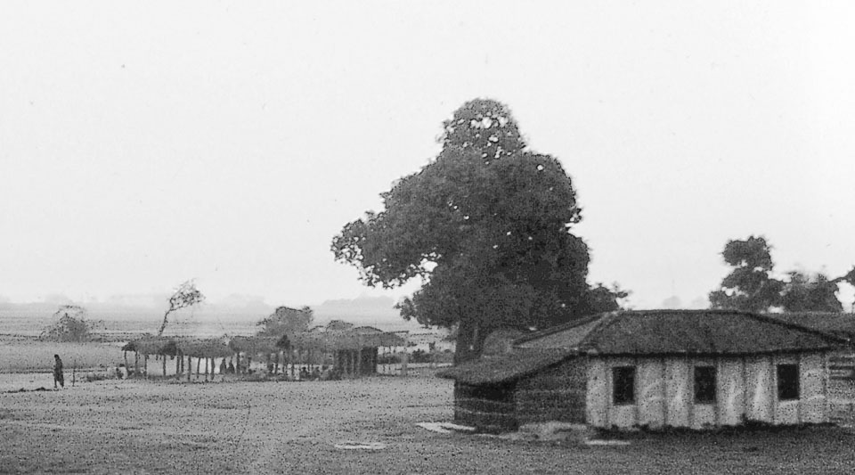 Caption: Date: 1967 Location: Biruwa Guthi, Parsa Description: View of the location for the weekly market at Biruwa Guthi. Picture may have been taken after most of the people had left. A few people can be seen under the thatched structures, left rear, along with a man walking, leaving the market. Picture is toward the east and taken from the straw pile in the thatching area. Panchayat house is right; walls for the shed on its left were subsequently covered with mud-dung mixture. Keywords: Bob Nichols, Nepal Photo History Project, Peace Corp Photo History, commerce, community, government building, haat, market