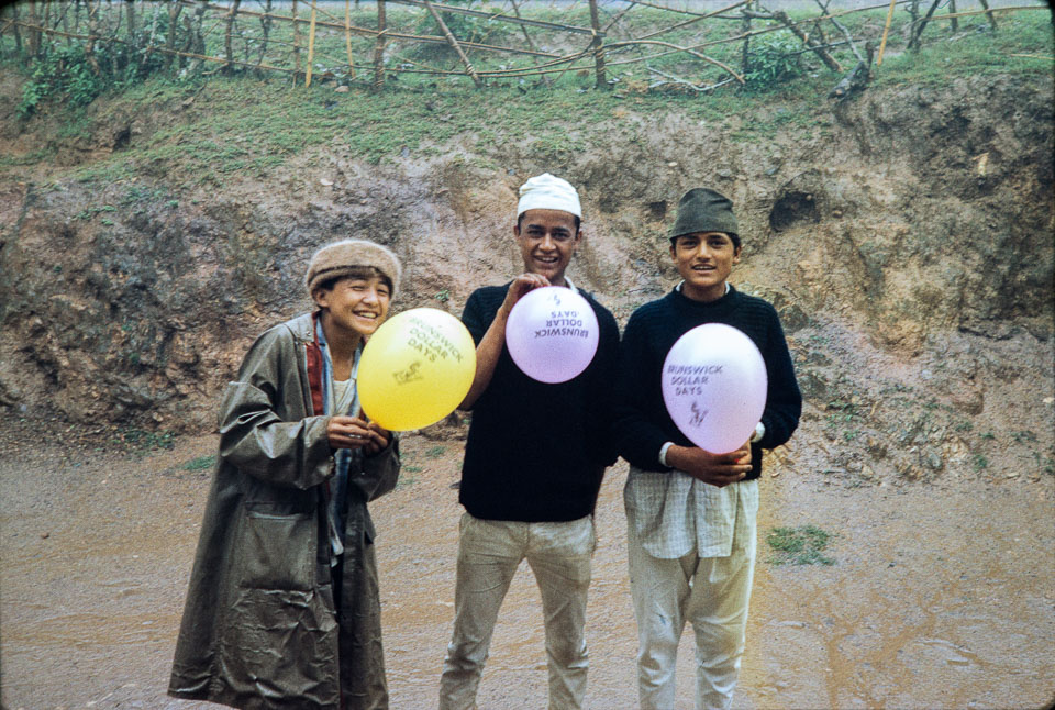 Caption: Date: 1967 Location: Dhankuta, Dhankuta Description: Local boys in Hulak Tol neighborhood of Dhankuta Bazaar displaying promotional balloons, given by a US company to a Peace Corps volunteer. Keywords: Brian Cooke, Nepal Photo History Project, Peace Corp Photo History, People, child, home life, play time