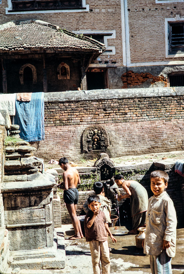 Caption: Date: 1965-10 Location: Kathmandu, Kathmandu Description: Bathers at public water tap, central Kathmandu. Keywords: Brian Cooke, Nepal Photo History Project, Peace Corp Photo History, bathing, community, home life, water supply