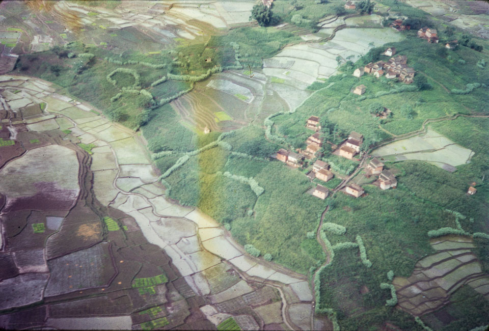 Caption: Date: 1965-10 Location: Kathmandu Description: Aerial view of rice paddy and village clusters, outside Kathmandu city. Keywords: Brian Cooke, Nepal Photo History Project, Peace Corp Photo History, aerial view, agriculture, field, landscape, town, village