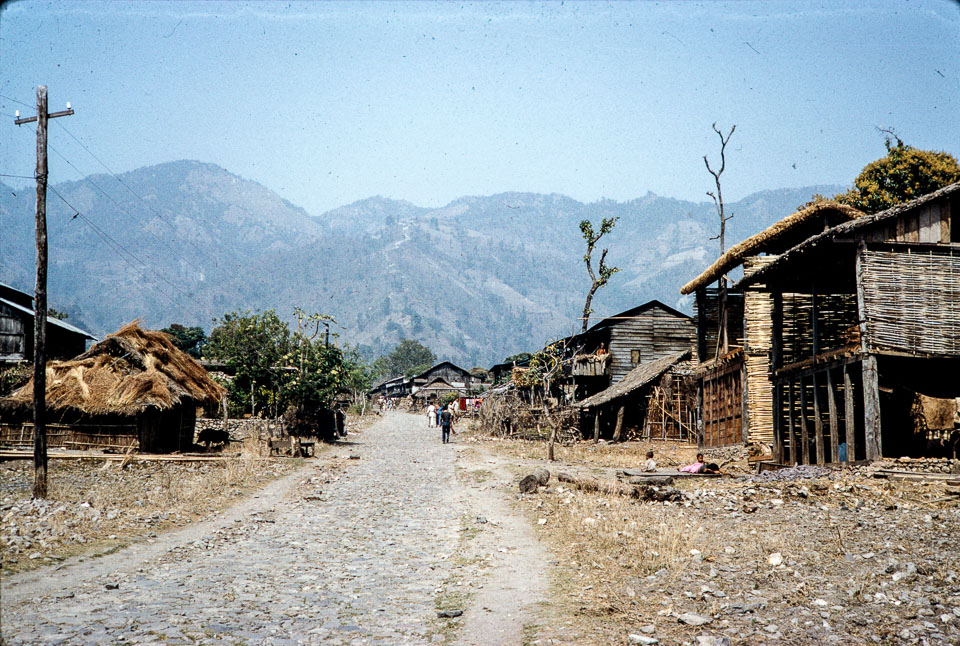 Caption: Date: 1965-1966 Location: Sunsari Description: The main trail leading from Dharan towards Dhankuta District to the north. The road is partially paved in the foreground. In the background, view of the steep trail leading up to the top of the lekh (minor mountain range) between Dharan and Dhankuta District. Keywords: Brian Cooke, Nepal Photo History Project, Peace Corp Photo History, community, road, street scene