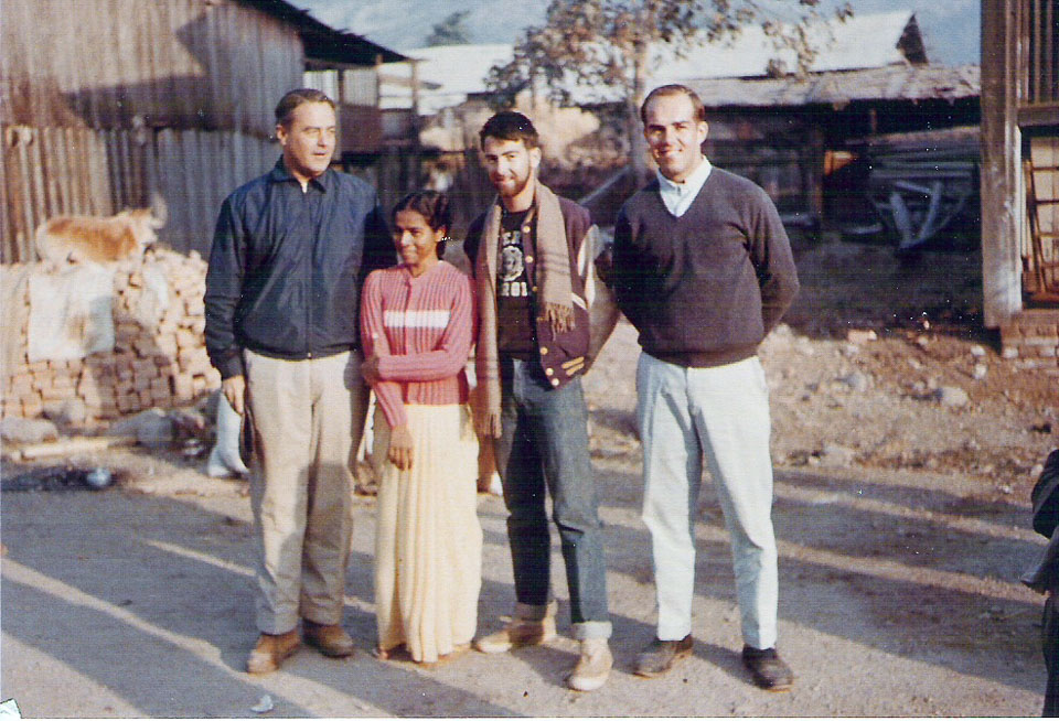 Description: The first Director of the US PEace Corps, Sargent Shriver, paid an overnight visit to volunteers who gathered in Dharan for his visit. Shown (left to right) Sargent Shriver, Hal Christensen's wife, Don Reese and Hal Christensen. Keywords: Don Reese, Nepal Photo History Project, PC volunteer, Peace Corp Photo History, People, group photo, named person