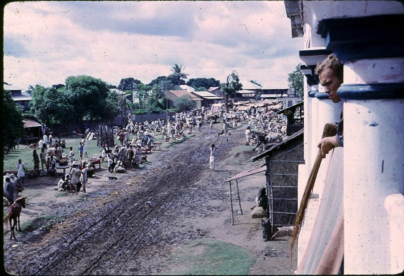 Description: Merchants early preparation for bazaar day in the village center. Peace Corps volunteer Norm Bramble observing from the only cement structure in the village. Keywords: Don Reese, Nepal Photo History Project, Peace Corp Photo History, commerce, community, haat, market, road, street scene