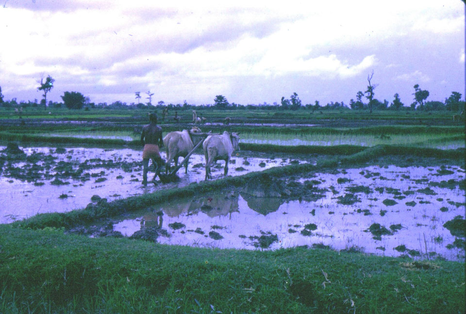 Description: Farmer preparing paddy for planting using bullocks at the beginning of the monsoon season. Rice plants in the paddy field in the background will be transplanted in the newly prepared paddy field. Keywords: Don Reese, Nepal Photo History Project, Peace Corp Photo History, agriculture, paddy, plowing