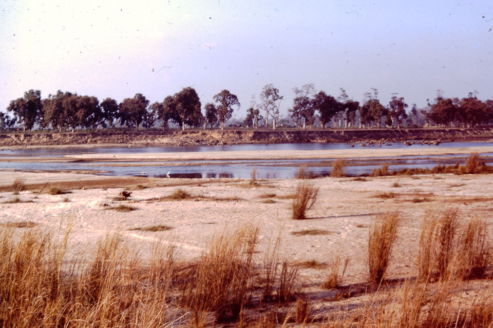 Caption: Date: 1976 Location: Chitwan Description: Chitwan wildlife reserve by the Rapti River; wild animals on right center, rear (in the river). Keywords: Jan Mascall, Nepal Photo History Project, Peace Corp Photo History, agriculture, animal, landscape, river, stream