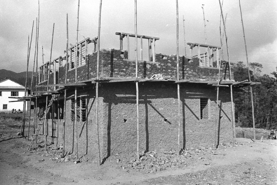 Caption: Date: 1972 Location: Hile, Dhankuta Description: House under construction in Hile. Keywords: Jan Mascall, Nepal Photo History Project, Peace Corp Photo History, building, handicrafts
