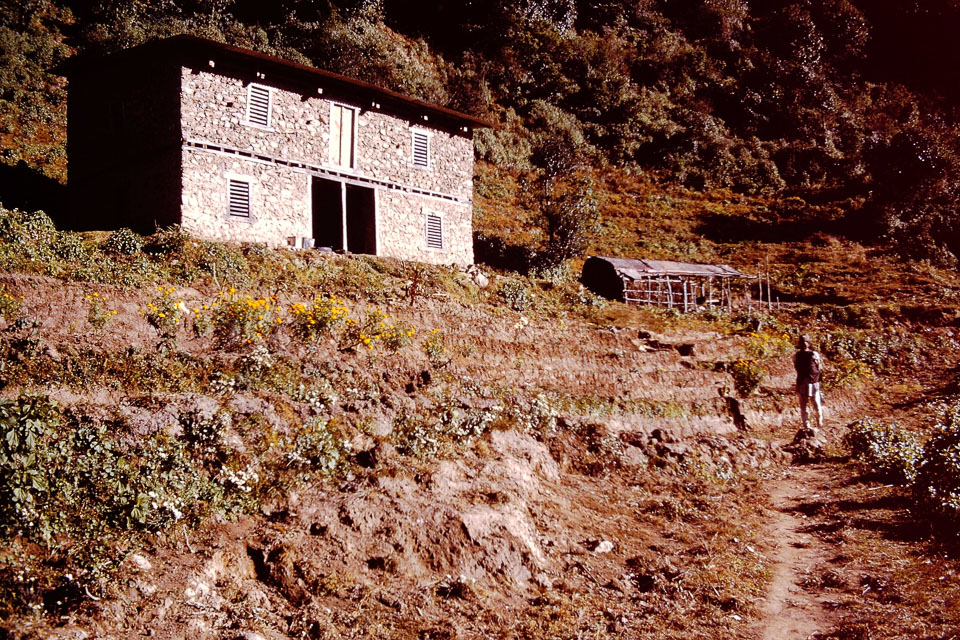 Caption: Date: 1970 Location: Hathikharka, Dhankuta. Description: Stone structure. Its purpose is unknown, though it was associated with an apple tree orchard project. Keywords: Jan Mascall, Nepal Photo History Project, Peace Corp Photo History, agriculture, landscape, orchard, unknown structure/ruin
