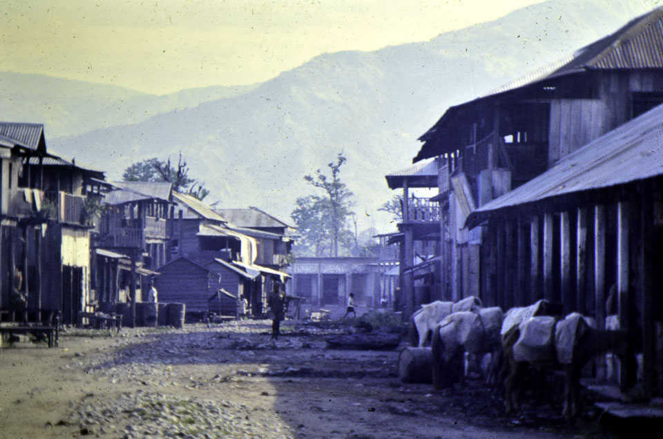 Caption: Date: 1971 Location: Arjundhara, Jhapa Description: The main street of Sanischare bazaar. Sanischare was merged with Parakhopi and Mechi in 2014 and the merged municipality is now called Arjundhara. Sanishare was an industrial and market town. It had Nepal's first fruit cannery (pineapple). Keywords: John Hughes, Nepal Photo History Project, Peace Corp Photo History, bazaar, commerce, community, street scene