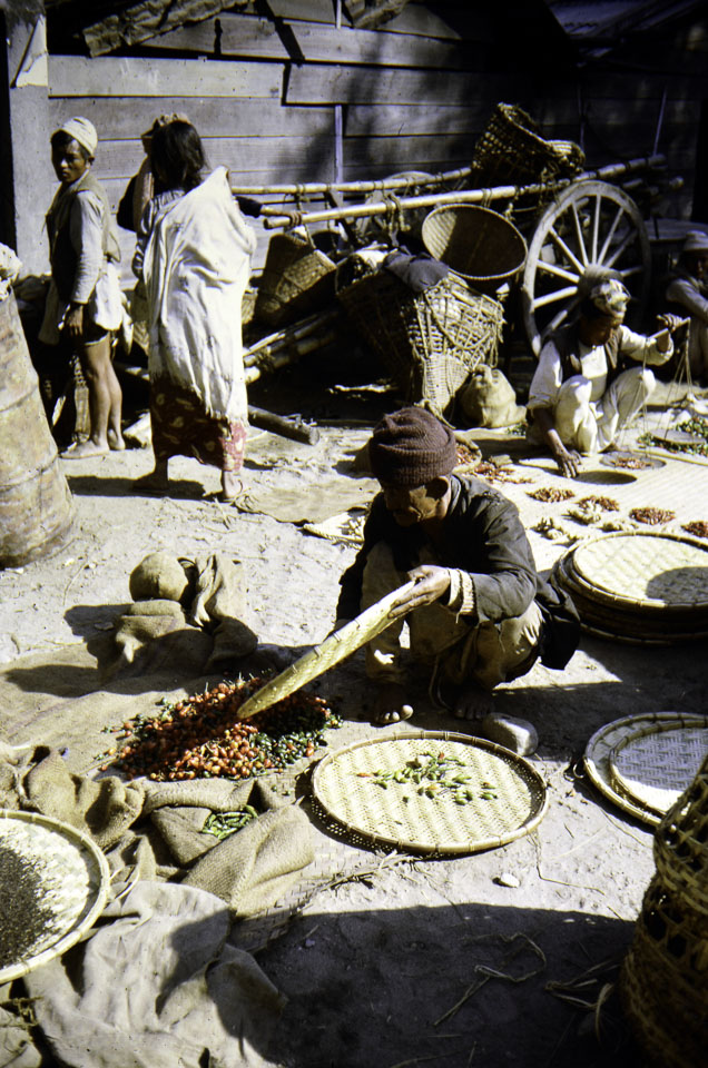 Caption: Date: 1971 Location: Arjundhara, Jhapa Description: Haat bazaar market scene in Sanischare bazaar. Sanischare was merged with Parakhopi and Mechi in 2014 and the merged municipality is now called Arjundhara. Sanishare was an industrial and market town. It had Nepal's first fruit cannery (pineapple). The scene shows the sale of khursanis. Keywords: John Hughes, Nepal Photo History Project, Peace Corp Photo History, commerce, haat, market