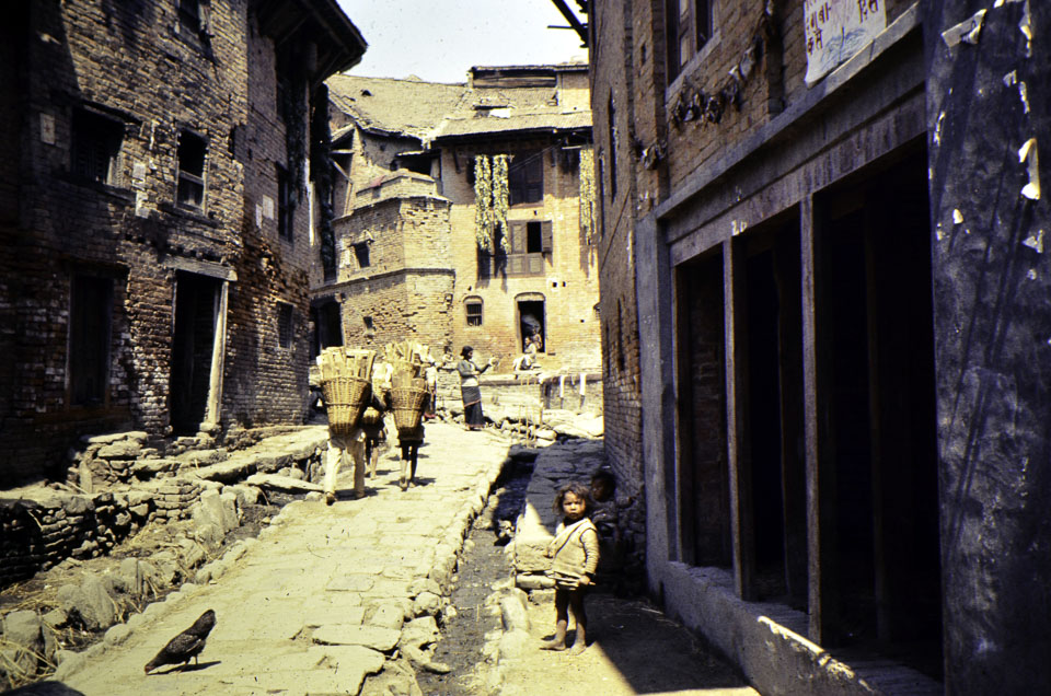Caption: Date: 1971 Location: Bhaktapur, Bhaktapur Description: Men carrying firewood loads on a street in Bhaktapur. Keywords: John Hughes, Nepal Photo History Project, Peace Corp Photo History, community, street scene