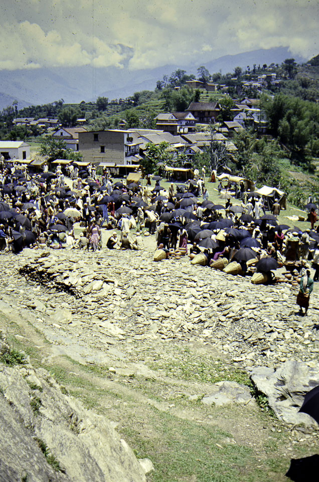 Caption: Date: 1971-05 Location: Chainpur, Sankhuwasabha Description: Chainpur's haat bazaar (Friday). Keywords: John Hughes, Nepal Photo History Project, Peace Corp Photo History, commerce, haat, market